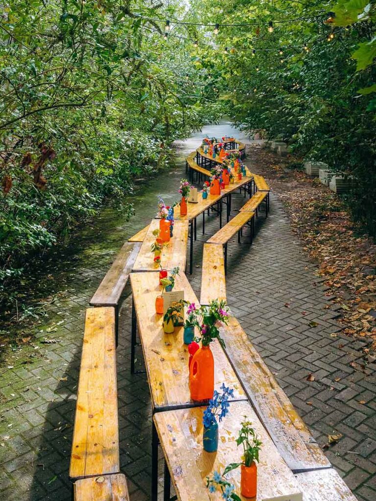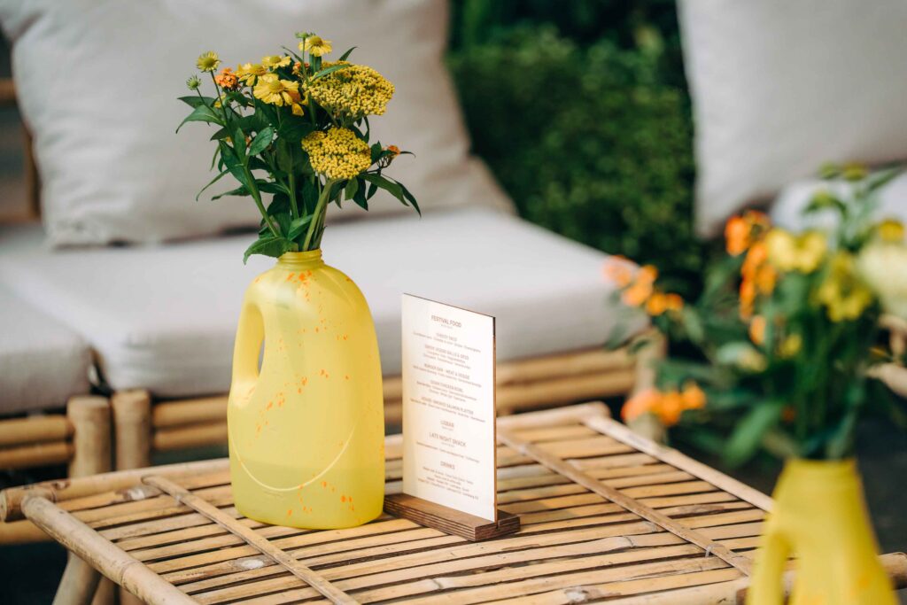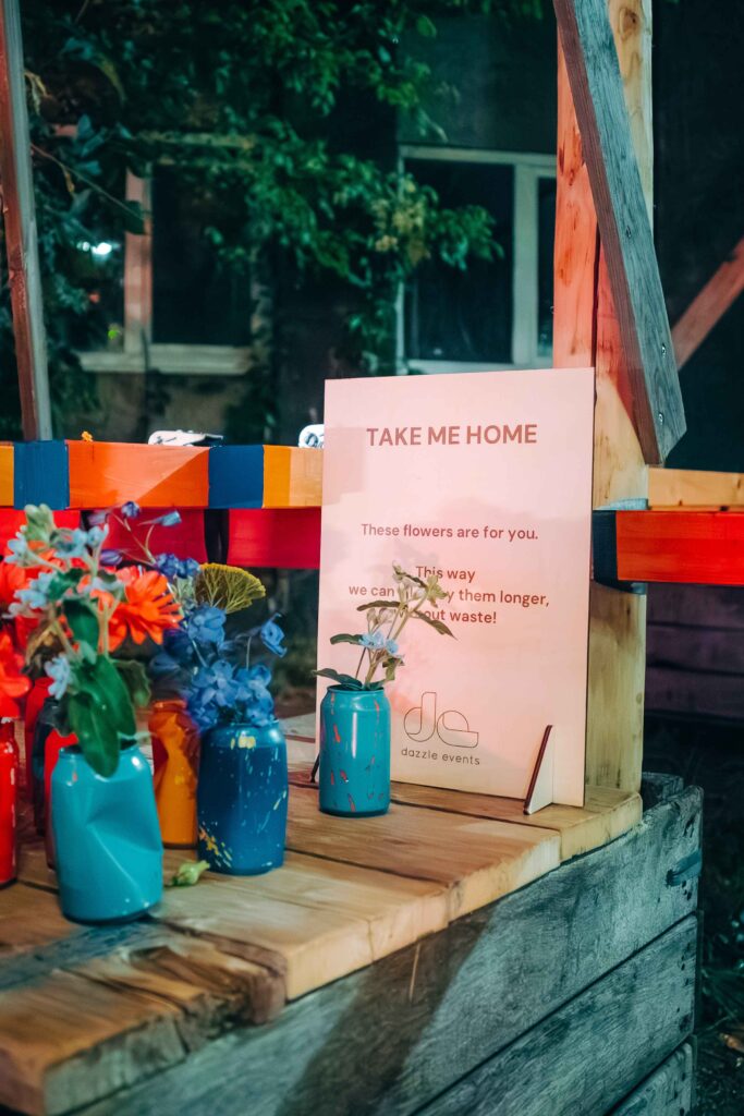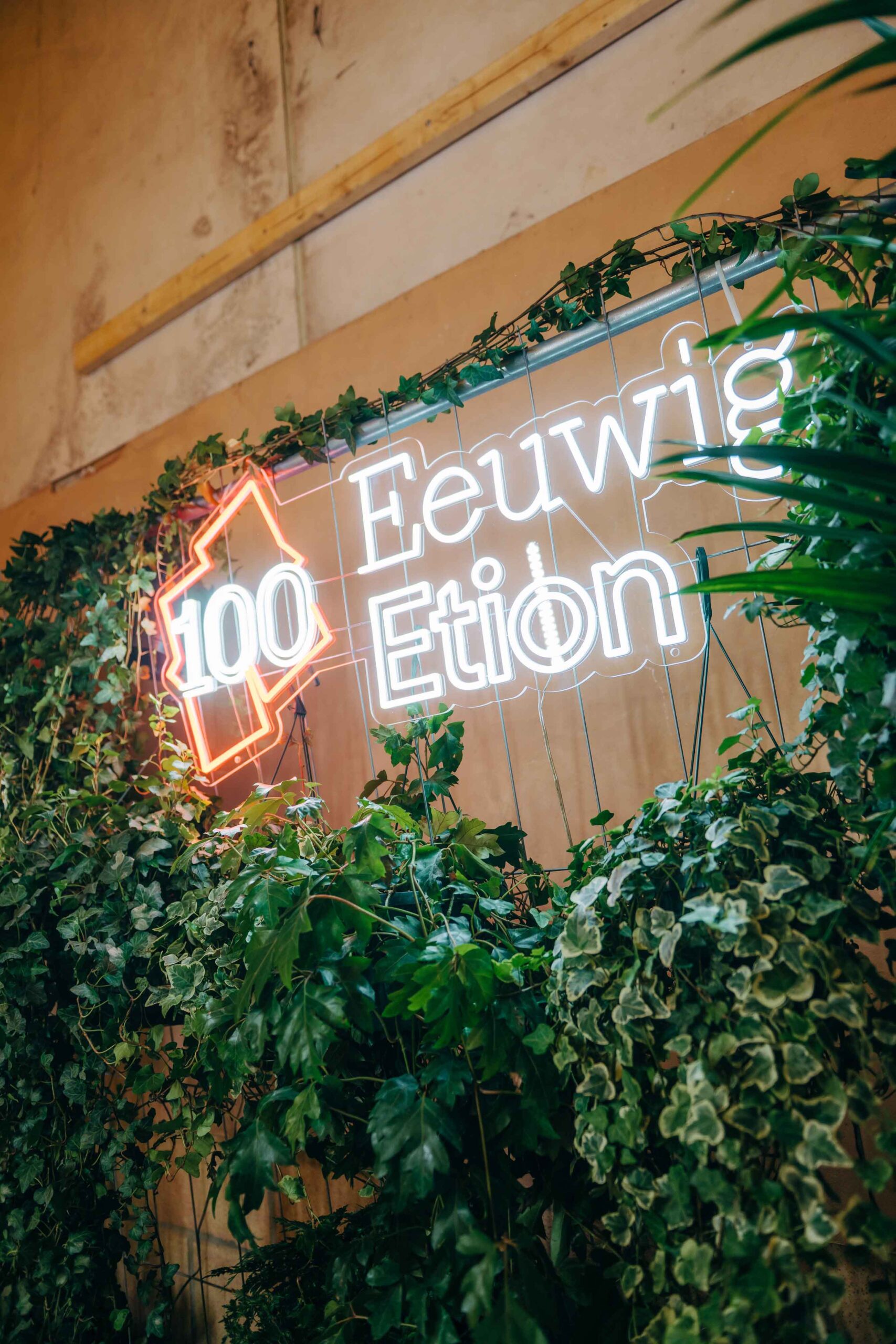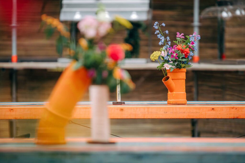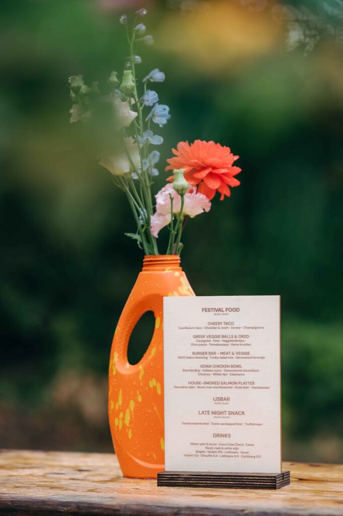 De tafeldecoratie kreeg een creatieve, circulaire insteek: lege frisdrankblikjes, plastic flessen en restjes rioleringsbuizen werden omgetoverd tot kleurrijke vaasjes vol bloemen. En die bloemen? Die gingen met de deelnemers mee naar huis in fleurige boeketjes. Ook de andere decoratie zal een tweede leven krijgen. Zo zal het neon-logo uit de fotobooth een mooi plekje krijgen op onze vernieuwde werkplek en zullen de strandstoelen op nog heel wat Etion-events opduiken.