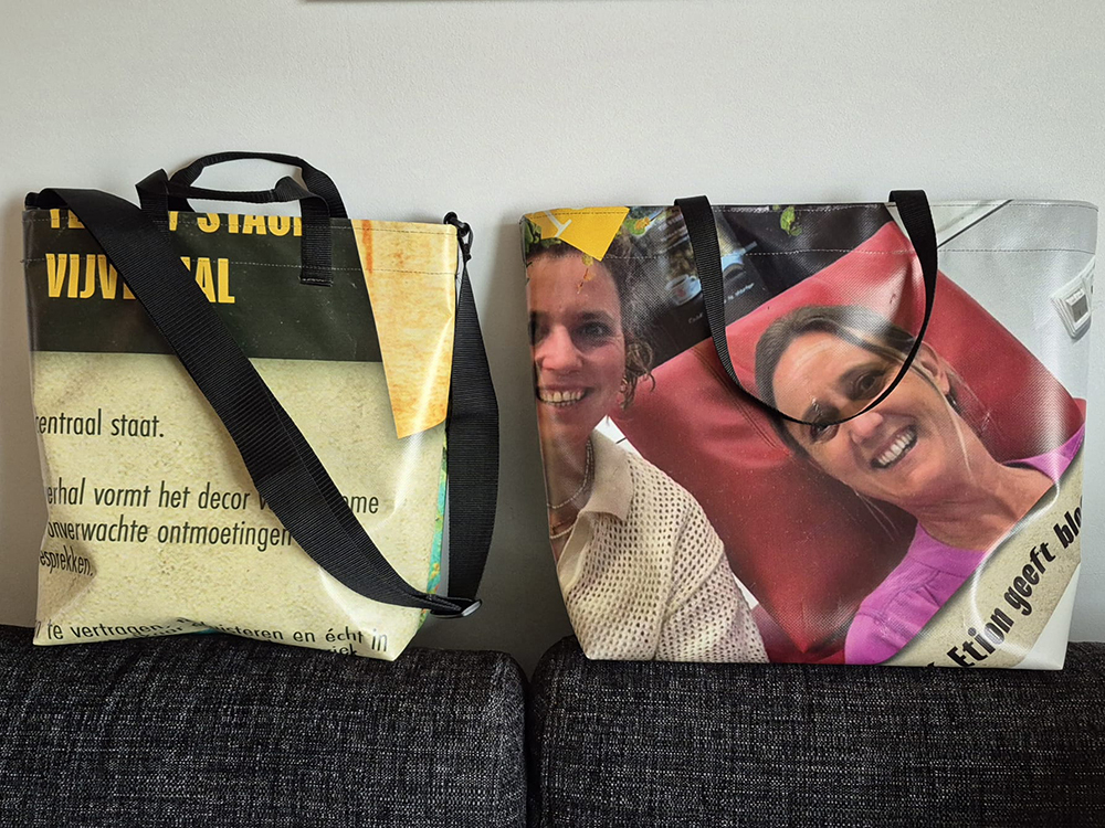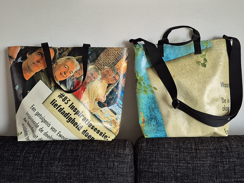 Op ons Eeuwig Etion Festival werden er heel wat zeildoeken bedrukt met fotomateriaal om overal op het terrein te hangen. Omdat we het zonde vonden dat deze maar éénmalig zouden gebruikt worden gingen we na het Festival op zoek naar een manier om deze op een creatieve en duurzame manier een tweede leven te geven.